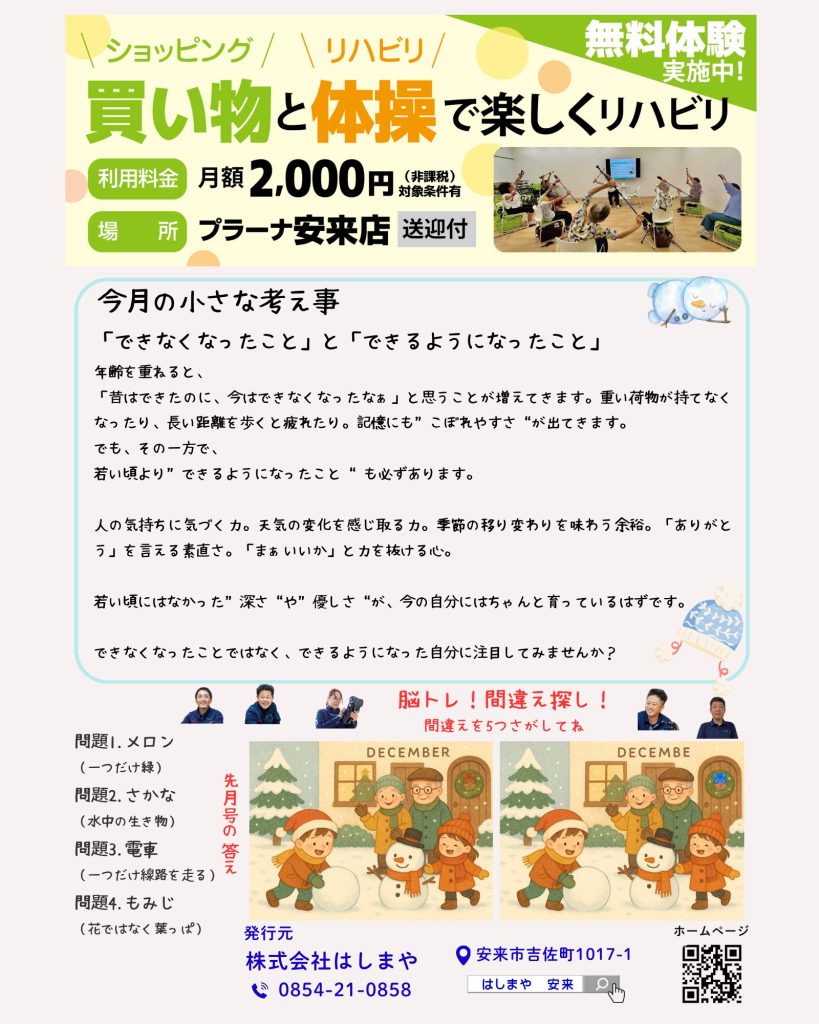 クリスマスもあっという間に過ぎ、いよいよ今年も残りわずかですね🌙今月の小さな考え事は、「できなくなったこと」と「できるようになったこと」年齢を重ねると、前よりできなくなったなぁ…と感じることも増えてきますがその一方で、今だからこそ気づけること、今だからこそできることもきっと増えています😊瓦版を読みながら、今年一年を少し振り返るそんな夜もいいですね😁脳トレの間違い探しやク…
